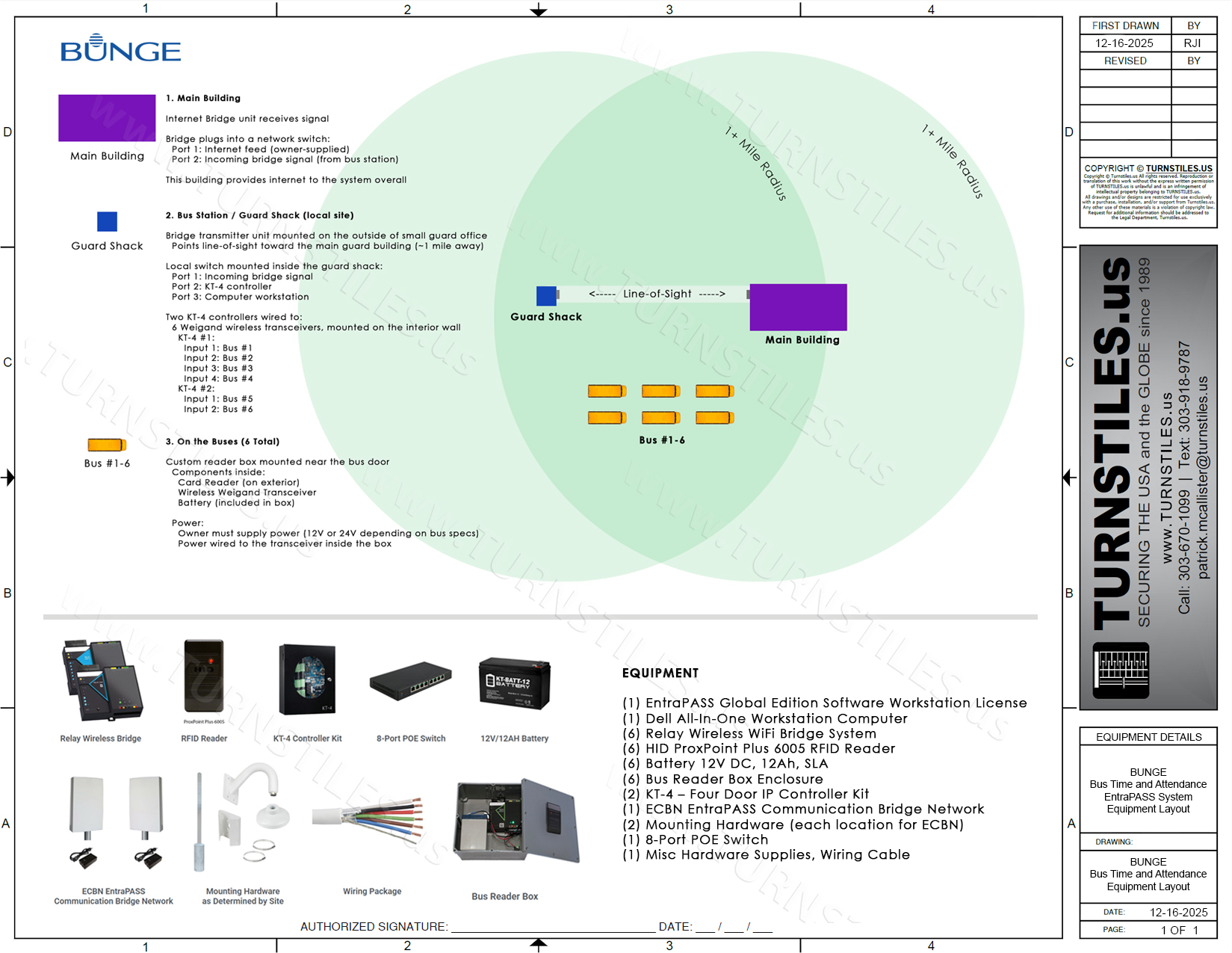 The team at TURNSTILES.us is honored to provide our EntraPASS Access Control System and engineering, drafting, and installation services to BUNGE for their Bus Time and Attendance Tracking System. Please find featured equipment information, photos, and project documentation below. We appreciate the opportunity to secure your facility.
