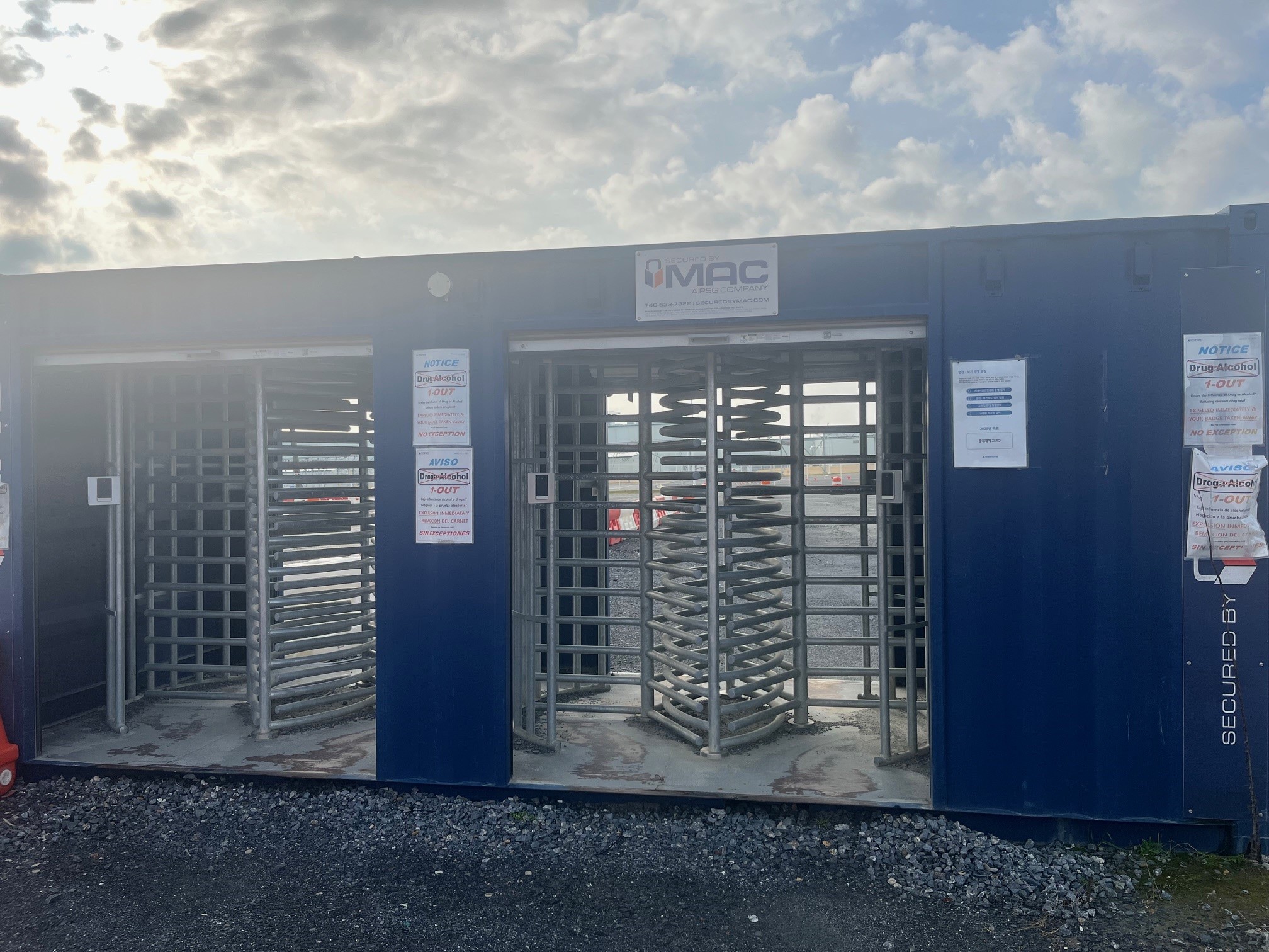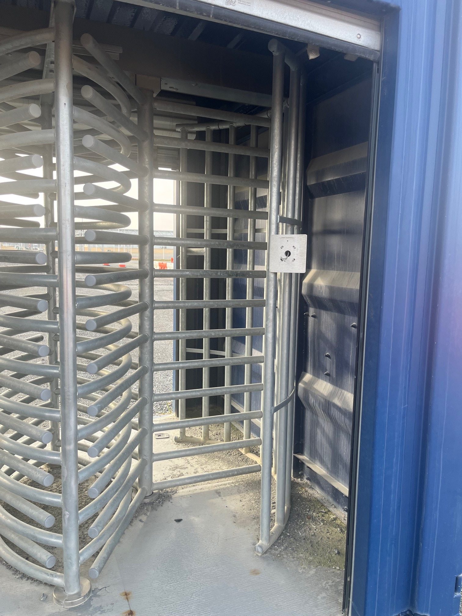 MAC Container with Two Full-Height Tandem Turnstiles (MAC-4T / M4TX) previously owned and in new condition. This 20′ enclosure ISO Container Access Control Building comes equipped with two tandem full-height industrial turnstiles for efficient access control. The turnstiles have two-way electric rotation and a galvanized finish. The dark blue container with white doors has a sleek look while ensuring durability in various weather conditions. Ready to ship to your location or arrange pickup. Add this item to your cart and buy online now! Contact us with any questions or to arrange delivery.